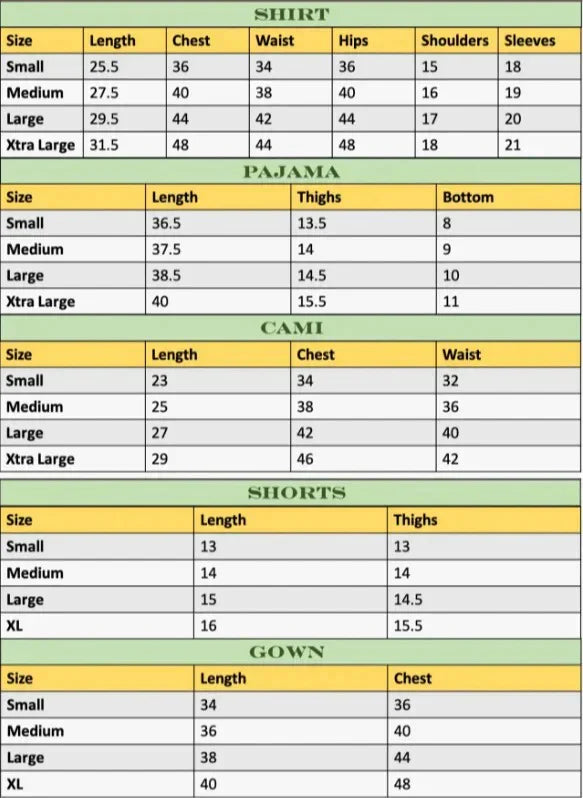 - Pajama: Coordinating pajama pants that offer comfort and a relaxed fit, perfect for lounging or sleeping.