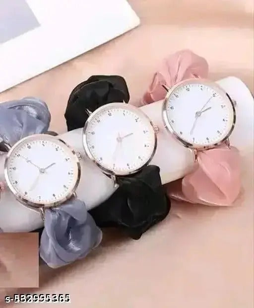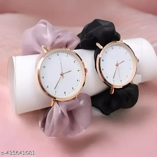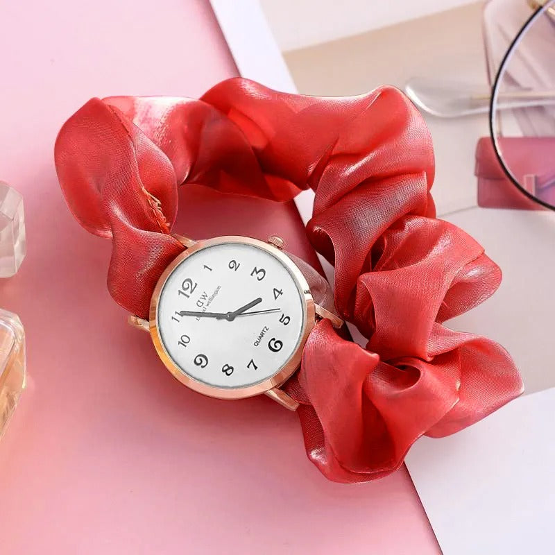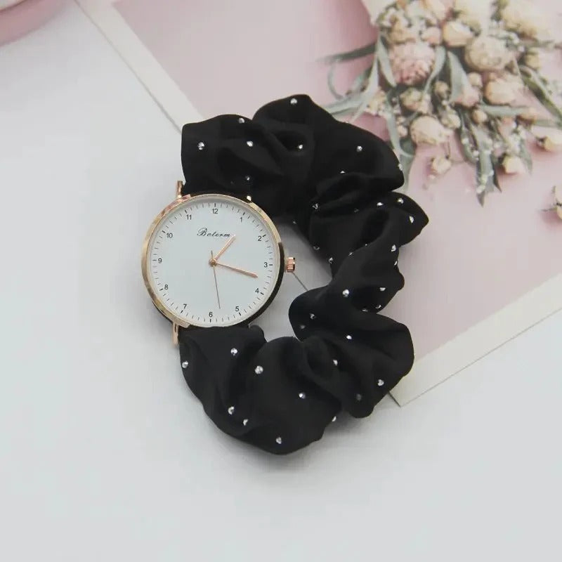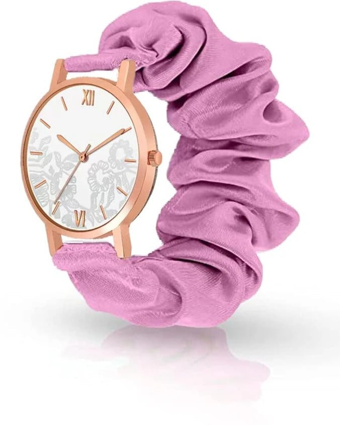 This stylish timepiece features a classic round dial with a minimalist design, set within an elegant rose gold-toned case. The unique selling point is its comfortable and fashionable scrunchie-style fabric band in a crisp white color, offering a soft and flexible fit on the wrist. This watch combines a trendy aesthetic with practical functionality, making it a versatile accessory suitable for both casual and more dressed-up occasions. The soft scrunchie band provides a gentle alternative to traditional watch straps, ensuring comfort throughout the day.