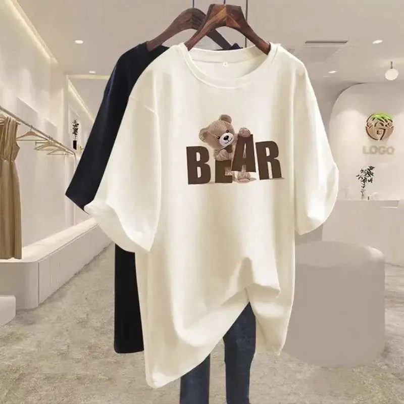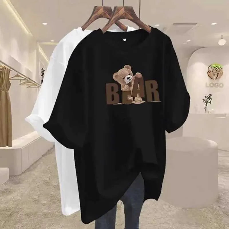 - Featuring a charming bear graphic with letter detailing, this short-sleeve top adds a playful touch to any outfit, making it a standout piece in your casual collection. It is a great alternative to a leopard print t shirt women's.