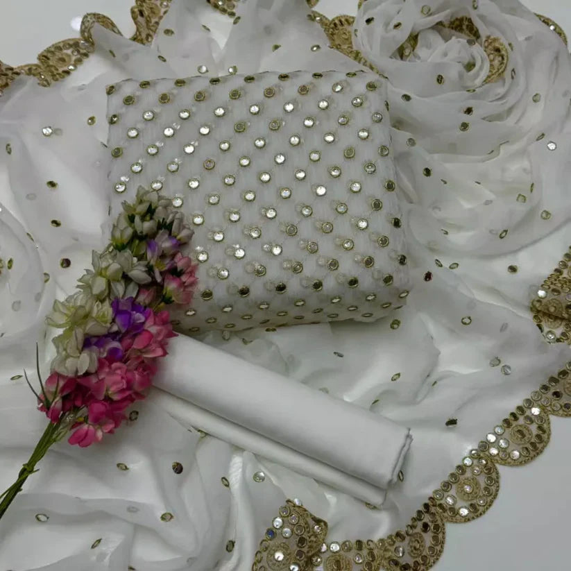 ” Hiba Bukhari Chiffon Banarsi Sequins Embroidery Work Dress “ – Front Heavy 9mm Embroidered Chiffon Suit – Full Embroidered Chiffon Back – Full Embroidered Chiffon Sleeves – Cutwork Embroidered Chiffon Dupatta – Plain Malai Trouser