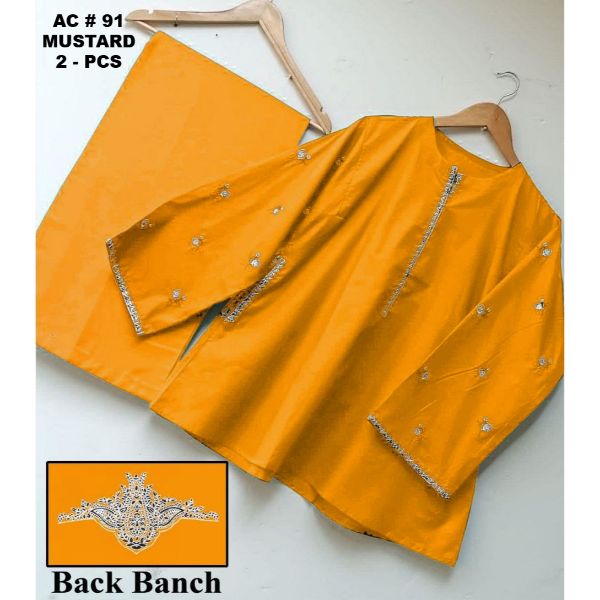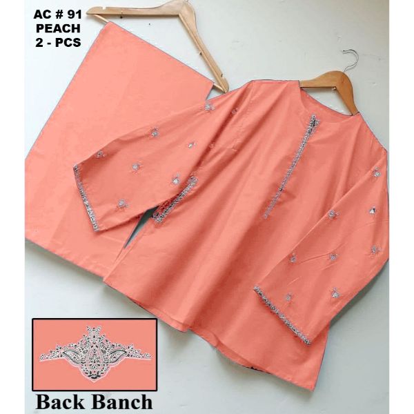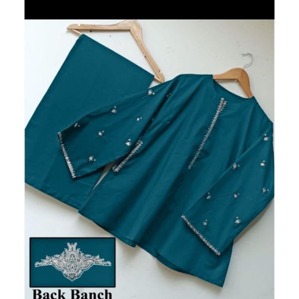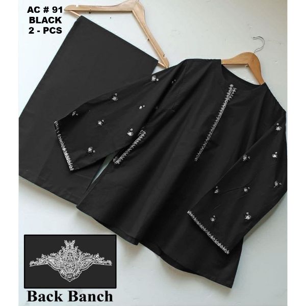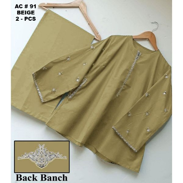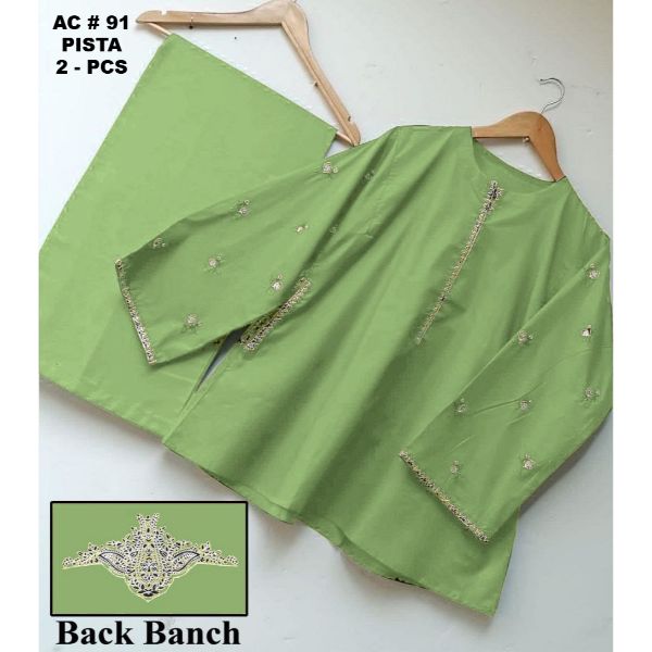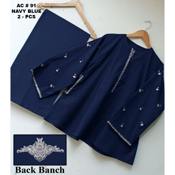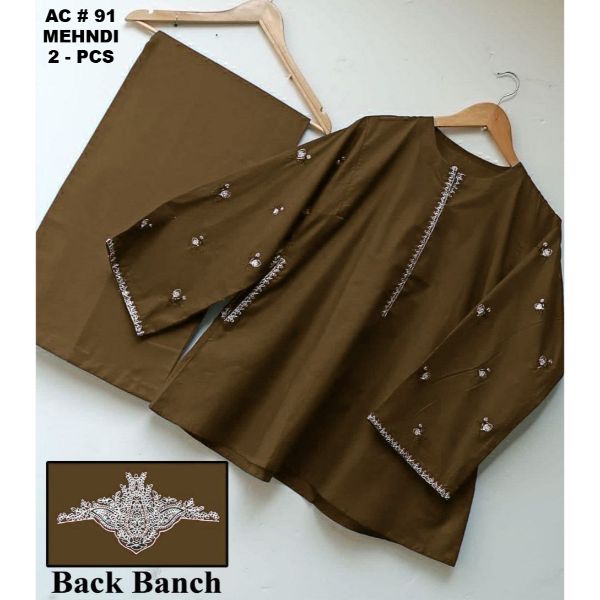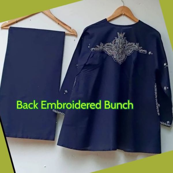 Pocket emb + back bunch 2pc Cotton dress, COTTON LAWN FABRIC