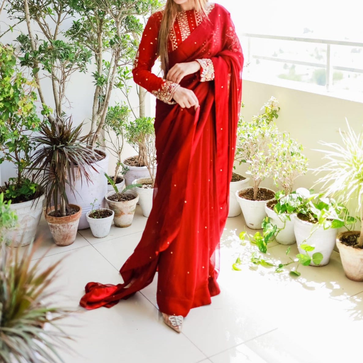 Silk Blouse with Sleeve Sequin Embroidery, Paired with Petticoat and Pearls-Adorned Saree