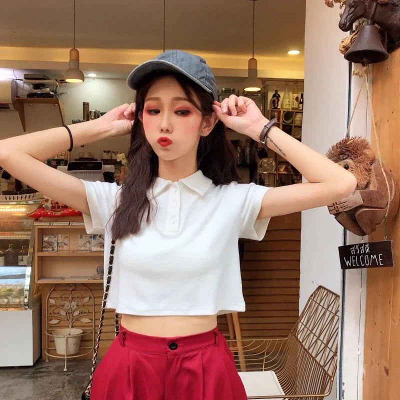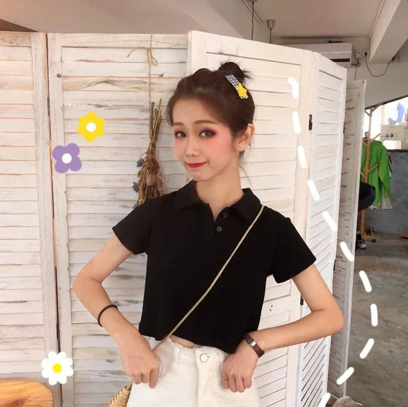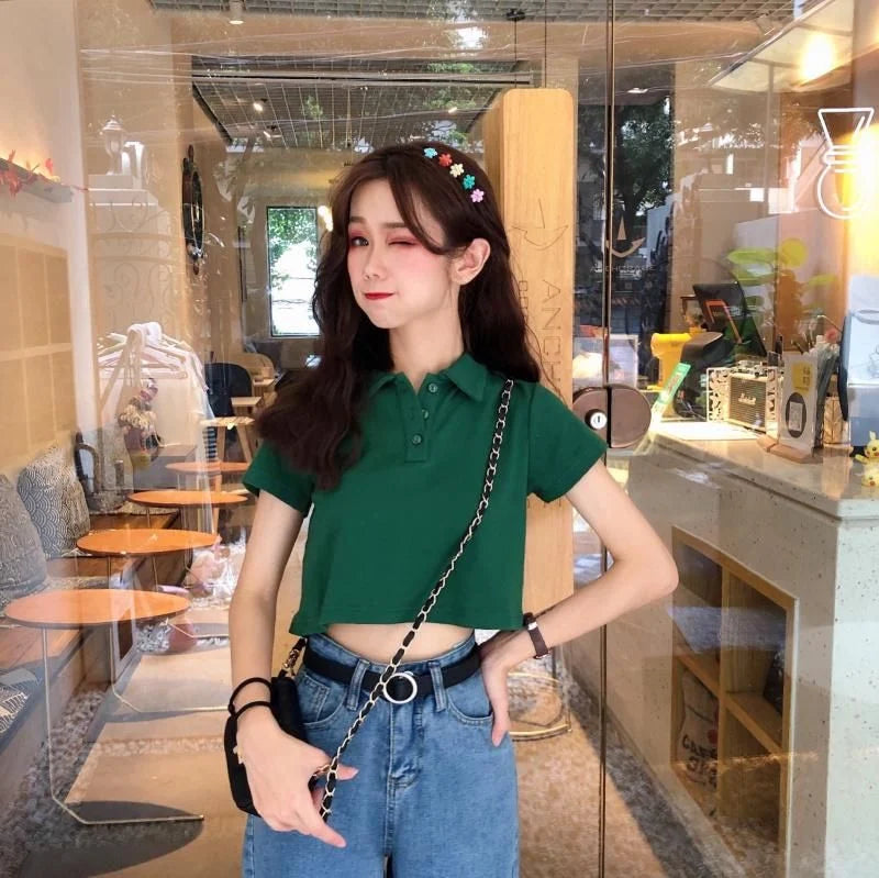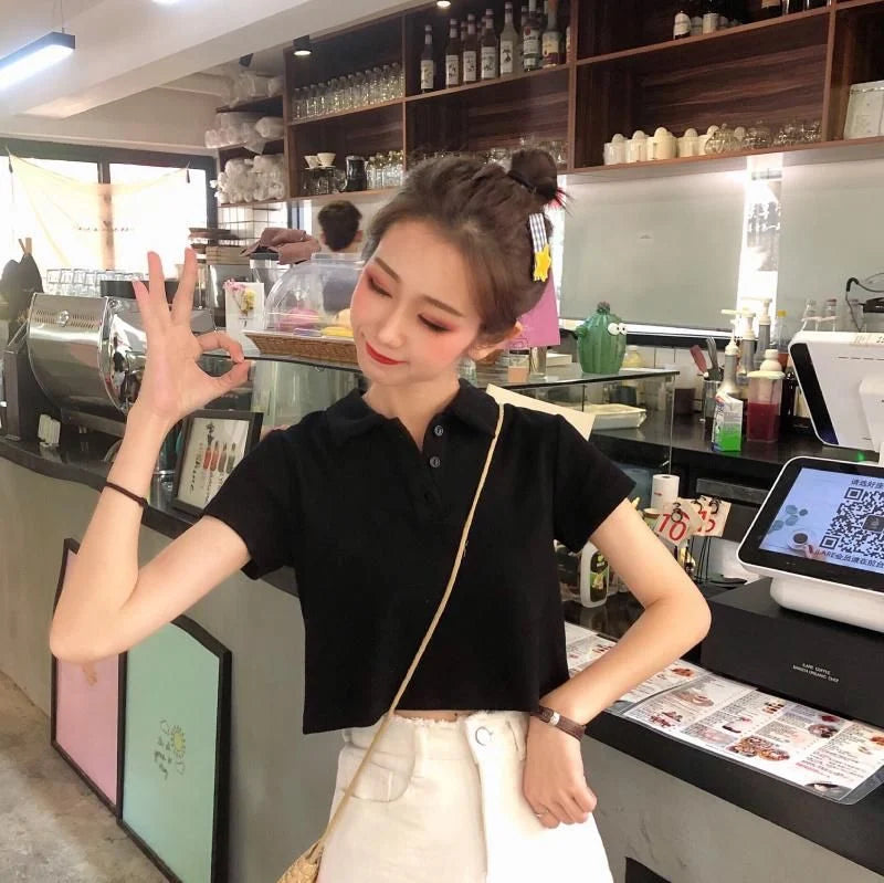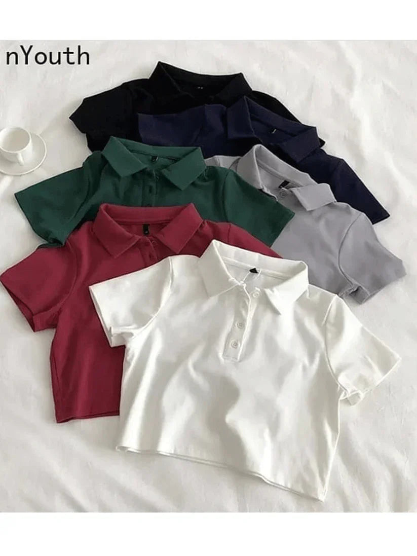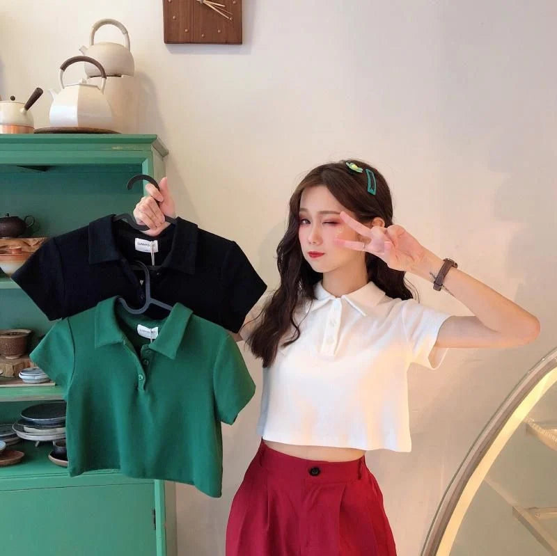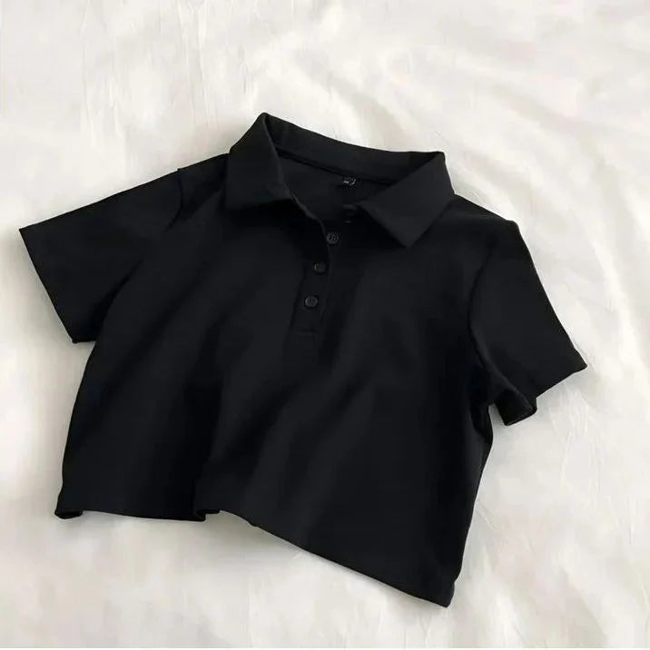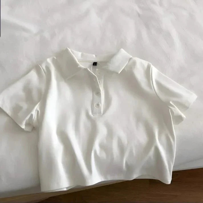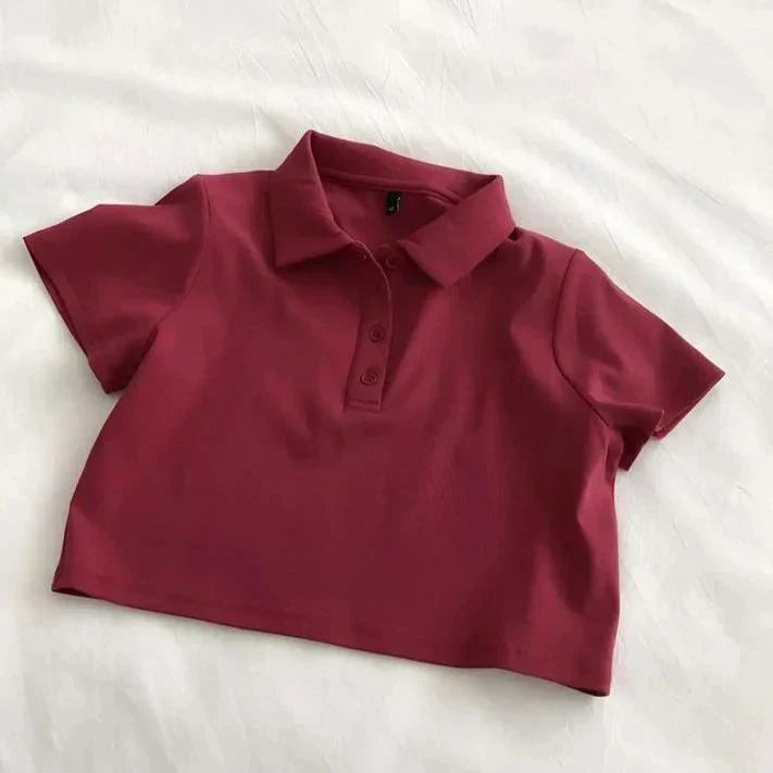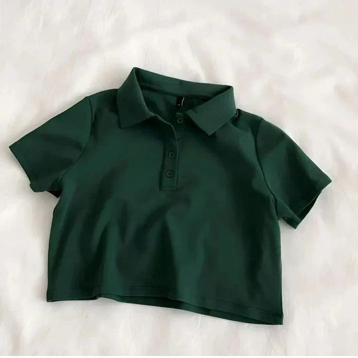 Whether you're pairing it with high-waisted jeans for a chic look or matching it with shorts for a laid-back vibe, this polo crop shirt is versatile enough for any occasion. The fitted design and clean lines make it a go-to piece for those who love to mix sporty elegance with a touch of casual sophistication.